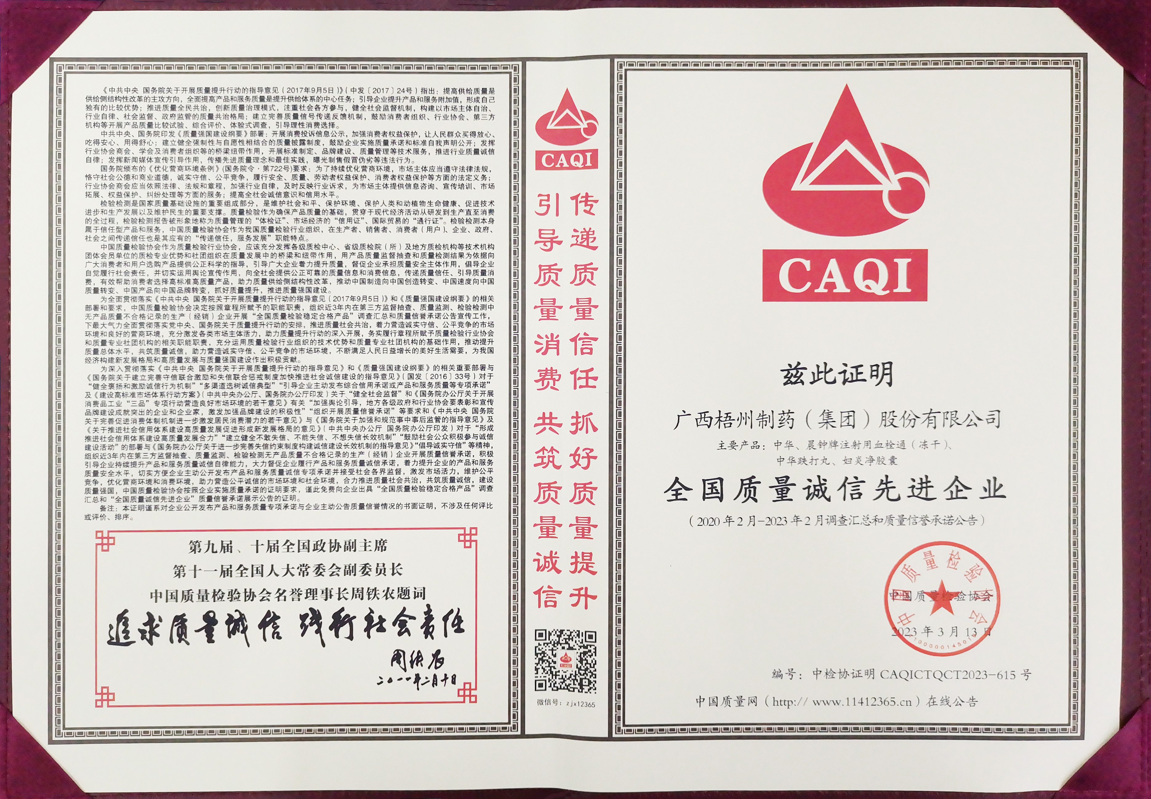 廣西梧州制藥(集團(tuán))股份有限公司榮獲2023年全國(guó)質(zhì)量誠(chéng)信先進(jìn)企業(yè)