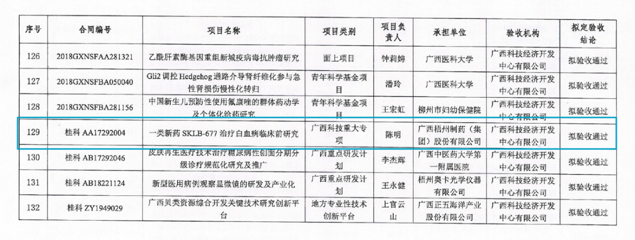 根據(jù)廣西科技項(xiàng)目評估中心發(fā)布的“廣西科技計(jì)劃項(xiàng)目擬定驗(yàn)收結(jié)論公示”(公示期:2022年7月22日—28日),中恒集團(tuán)梧州制藥承擔(dān)的廣西科技重大專項(xiàng)《一類新藥SKLB677治療白血病的臨床前研究》項(xiàng)目通過驗(yàn)收。
