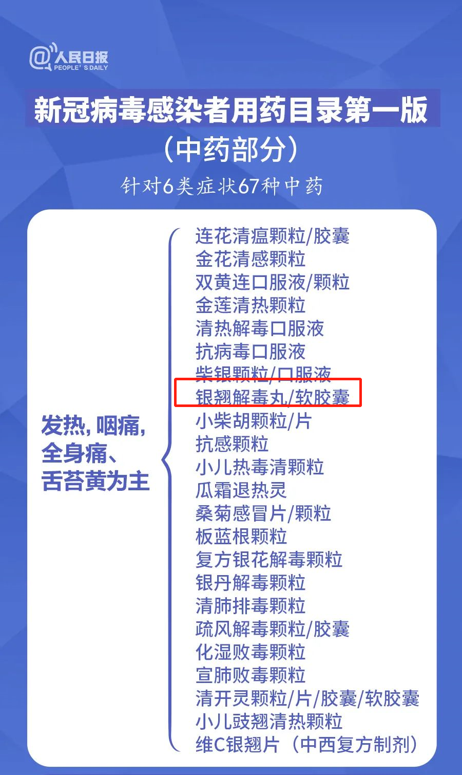 在近日發(fā)布的《新冠病毒感染者用藥目錄第一版》中,銀翹解毒丸入列,同樣也是以連翹和金銀花作為君藥,同樣主治風(fēng)熱感冒,與連花清瘟制劑一樣可用于治療發(fā)熱頭痛,咳嗽,咽喉疼痛等癥候。