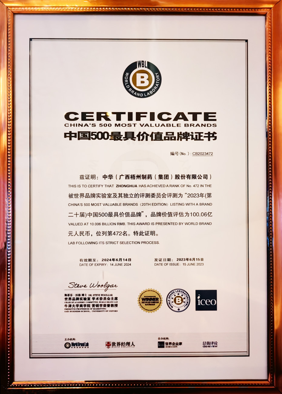 早在2021年,中國品牌建設(shè)促進(jìn)會已將“中華”品牌列入“中華老字號”組50強,品牌價值為70.52億元。2023年,“中華”品牌經(jīng)世界品牌實驗室及其獨立的評測委員會評測認(rèn)證,成功入選2023年(第二十屆)中國500最具價值品牌,獲此殊榮,是世界品牌實驗室對梧州制藥持續(xù)推進(jìn)“中華”品牌建設(shè),實現(xiàn)品牌價值不斷提升的充分肯定。同時,彰顯了公司穩(wěn)健的發(fā)展態(tài)勢和強勁的品牌實力。
