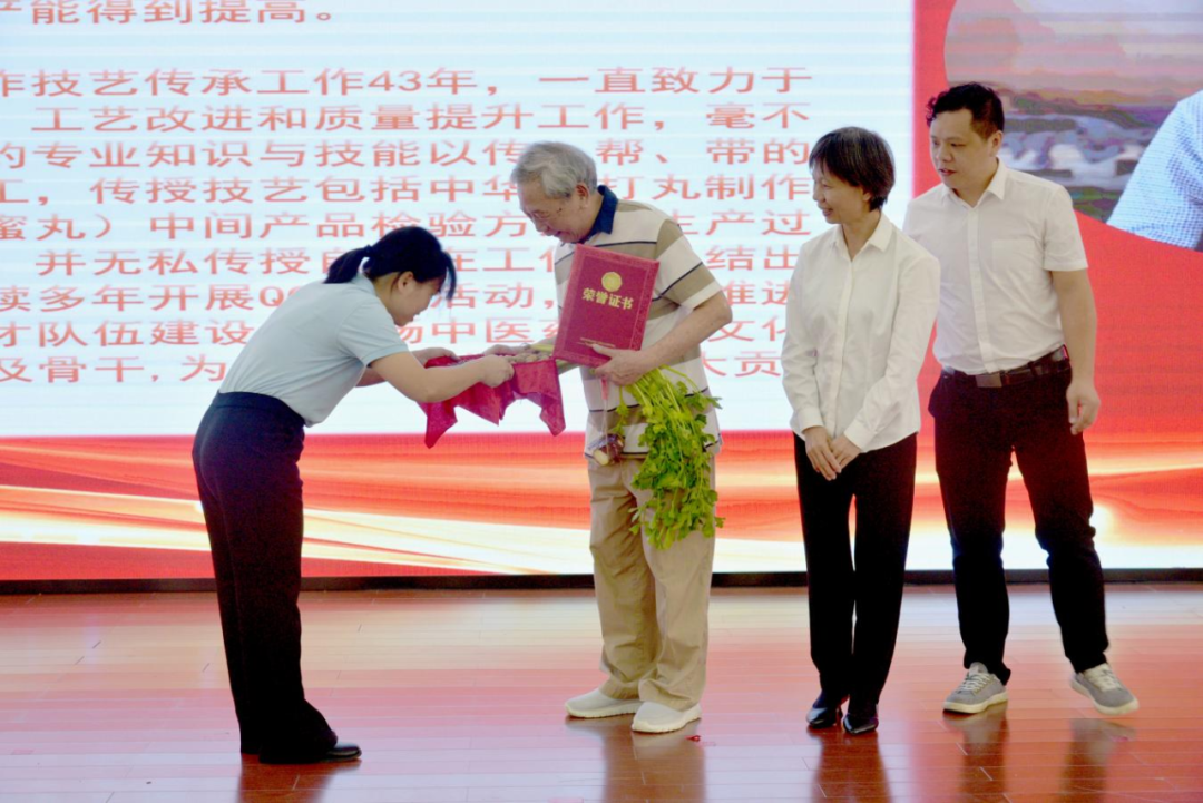 活動(dòng)還專門邀請了中華跌打丸獻(xiàn)方人陳鐵的兒子,現(xiàn)已83歲高齡的原跌打丸生產(chǎn)車間主任陳永強(qiáng)到會(huì),由公司黨委書記、董事長黃文彩為其頒發(fā)“中華跌打丸制作技藝——金牌師父”榮譽(yù)稱號(hào)。“中華跌打丸制作技藝”的第三、第四、第五代非遺傳承人依次上臺(tái),同樣用傳統(tǒng)的束脩六禮對(duì)陳老進(jìn)行了謝師,以此來表達(dá)對(duì)師父的感激之情、教導(dǎo)之恩。