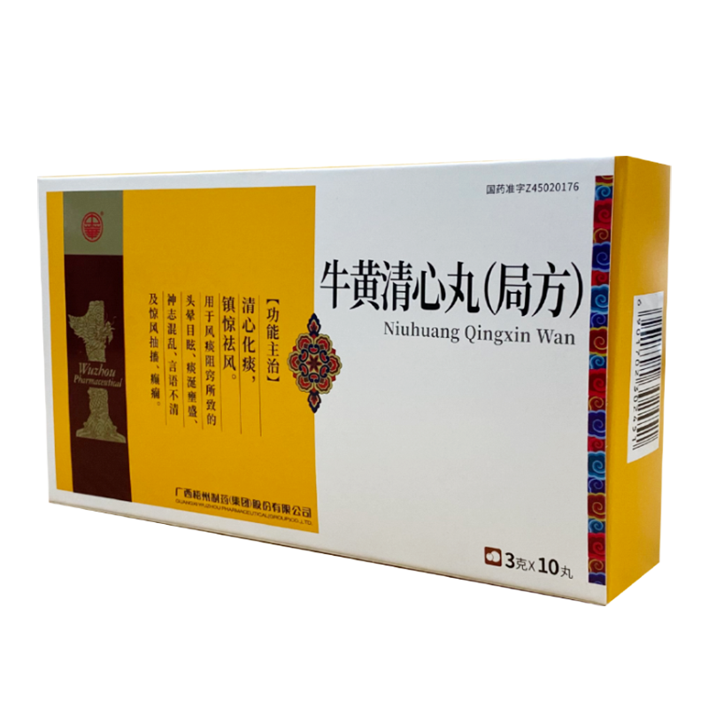 【藥品名稱】通用名稱:牛黃清心丸(局方)漢語拼音:Niuhuang Qingxin Wan【成 份】體外培育牛黃、當歸、川芎、甘草、山藥、黃芩、炒苦杏仁、大豆黃卷、大棗、炒白術、 茯苓、桔梗、防風、柴胡、阿
