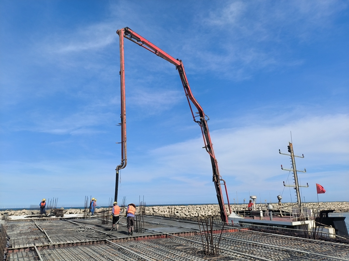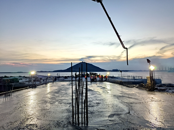 ▲油品碼頭工程水域公用管廊棧橋面層澆筑施工 油品碼頭項目臨時黨支部深入貫徹習近平新時代中國特色社會主義思想,緊緊圍繞茂名港集團黨委“項目為王”工作部署,以茂名港口岸開放時間節(jié)點為目標,加強基層黨組織的建設,把支部建設在工程一線上,充分發(fā)揮黨支部的戰(zhàn)斗堡壘作用,積極肩負建設單位組織、溝通、協(xié)調的主體責任,切實做到責任不“臨時”。通過統(tǒng)籌設計、監(jiān)理及施工單位的技術人員力量,成立技術攻關小組、黨員示范崗,帶頭展開“立項式”攻關。經過精心組織,科學施工,不斷優(yōu)化方案,加強工序銜接,合理調配資源,克服疫情影響、海上風浪大、作業(yè)面交叉施工、施工難度大等難點,做到了工程安全有保障、工程質量穩(wěn)定可控、工程進度有序推進。