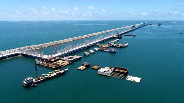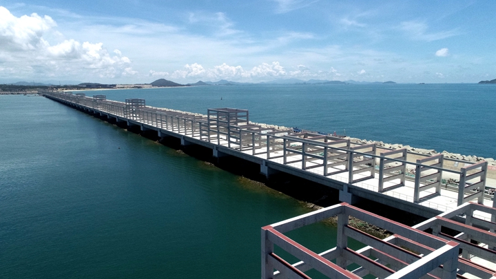 ▲茂名港務中心項目 在這乘風破浪、跨越發(fā)展的十年里,茂名港深水大港崢嶸初現(xiàn),碩果累累——實現(xiàn)資產(chǎn)規(guī)模和融資規(guī)!半p百”目標,為濱海新區(qū)基礎設施建設和茂名港集團發(fā)展提供資金保障,融資平臺作用凸顯;自建、參建省市重點項目超30個,推動博賀新港區(qū)東西防波堤、10萬噸級成品油碼頭、東區(qū)化工碼頭、東區(qū)化工倉儲、粵西LNG造陸項目、茂名港務中心、博賀灣大橋、供水工程等一批省市重點項目建設投用,充分發(fā)揮濱海新區(qū)項目建設主體作用,加快推進口岸開放工作,為茂名經(jīng)濟實現(xiàn)高質(zhì)量發(fā)展增添動力。 前瞻布局,打造南海能源新通道,積極融入茂名“向海而興”發(fā)展大局。
