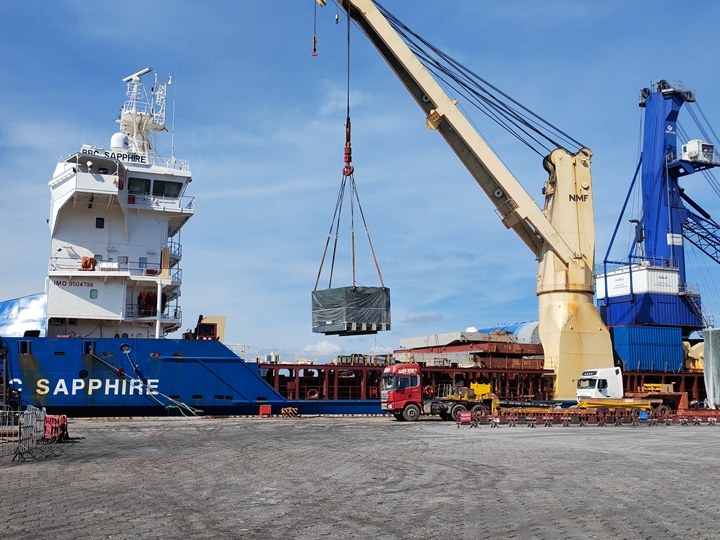 近日,外貿(mào)船舶“藍(lán)寶石”輪順利靠泊港口經(jīng)營(yíng)公司碼頭裝運(yùn)大型外貿(mào)設(shè)備,這是港口經(jīng)營(yíng)公司今年以來(lái)首次靠泊的萬(wàn)噸級(jí)外貿(mào)船舶。
