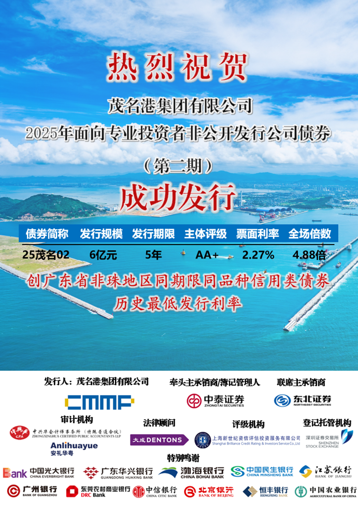7月3日,茂名港集團在資本市場再度傳來捷報,成功發(fā)行2025年度第二期私募公司債券,發(fā)行規(guī)模6億元。此次發(fā)行票面利率低至2.27%,創(chuàng)歷史新低,不僅進一步優(yōu)化了集團融資結(jié)構(gòu),更為港口業(yè)務(wù)發(fā)展注入強勁動能,彰顯出資本市場對其發(fā)展前景的高度認(rèn)可。